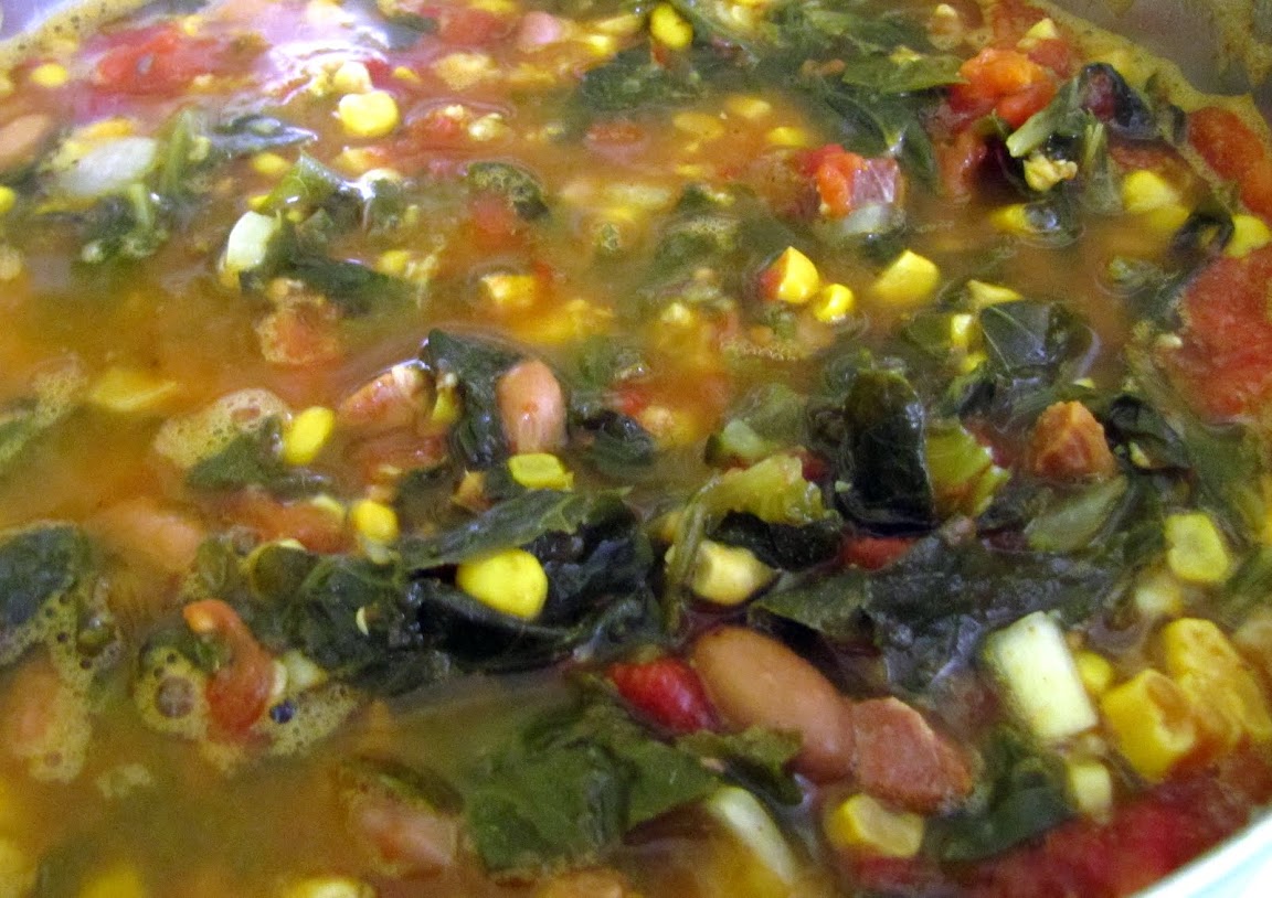 This is pretty basic fare around these parts at this time of year. I threw this soup together in just a matter of minutes, but it’s so satisfying. A can of tomatoes, a can of corn, a can of collard greens with bits of ham, a can of pinto beans, a chopped up onion and a couple of cloves of garlic, a little homemade chicken stock, some salt, pepper, cumin, and dried basil. Voila! Most stuff was homegrown, and it was all local except for the spices (although the basil was homegrown) and beans.